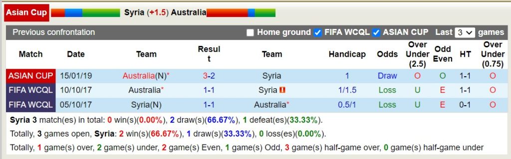 Trong quá khứ, Syria đấu với Úc cũng không phải là thế trận quá áp đảo dành cho đội bóng xứ Chuột Túi. Họ thắng Syria 1 trận sát nút và để hoà 2 trận. Trong một trận đấu nhiều toan tính như hôm nay, rất có thể Úc sẽ chỉ thắng Syria 1 bàn cách biệt. Và cũng phải nói thêm, dù đang có chuỗi 10 trận khá phập phù thì Syria cũng mới chỉ để thua duy nhất 1 trận với khoảng cách lớn hơn 1 bàn.